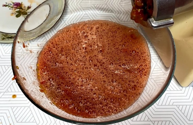 - Ще нам знадобиться 0,5 кг помідорів. Їх потрібно пропустити через м’ясорубку, щоби вийшов томат.