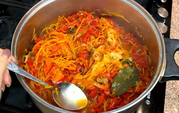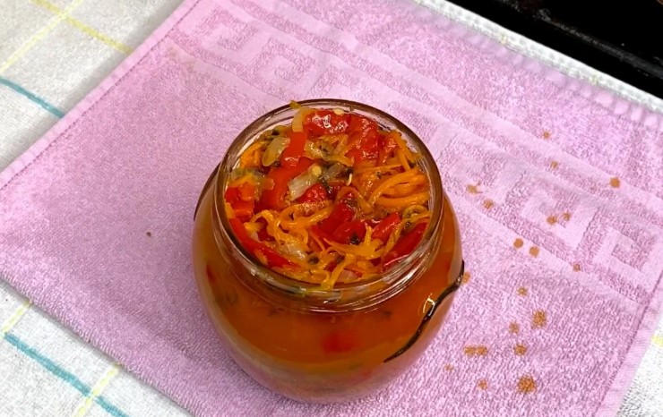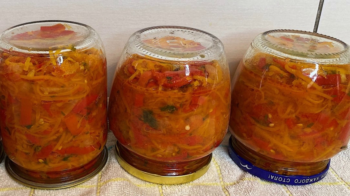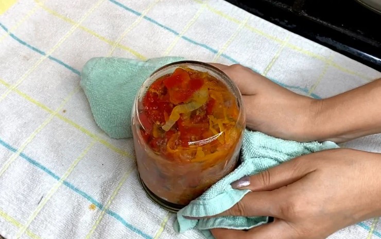 - Тепер розливаємо по баночках та накриваємо кришками. Салат потрібно ще простерилізувати.