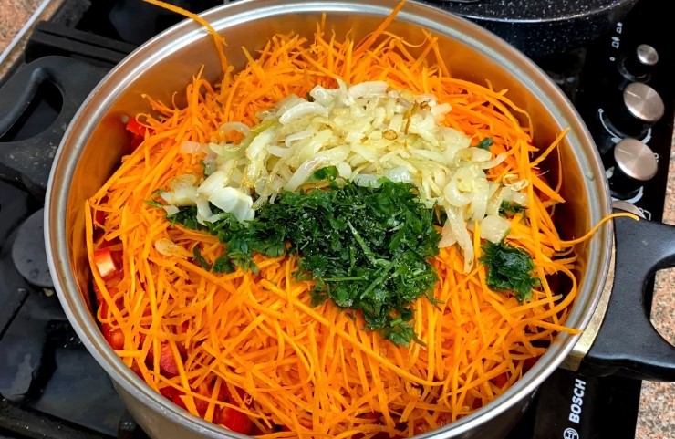 - Далі в каструлю виливаємо томат, висипаємо нарізаний болгарський перець, моркву соломкою, петрушку, обсмажену цибулю.