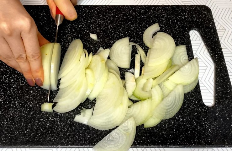 - Далі беремо 300 г цибулі. Його потрібно очистити та нарізати півкільцями. Якщо Ви не любите довгу цибулю, наріжте її дрібніше.