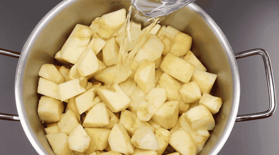 Тепер підготовлені гарбуз та яблука пересипаємо в каструлю. У мене каструля на 6 л, а гарбуза та яблук я взяла по 1 кг і це вже в очищеному вигляді. Заливаємо водою так, щоб усі шматочки були занурені у воду.
