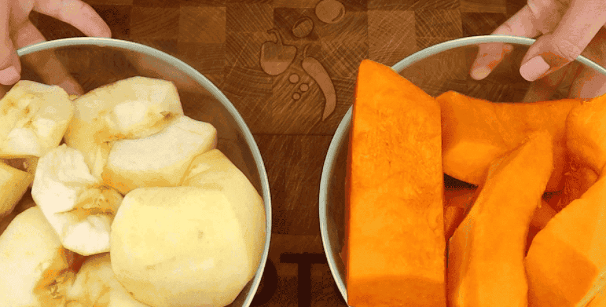 Нам знадобиться гарбуз та яблука в рівних пропорціях. Видаляємо насіння та очищаємо його від шкірки. Нарізаємо на довільні шматочки.