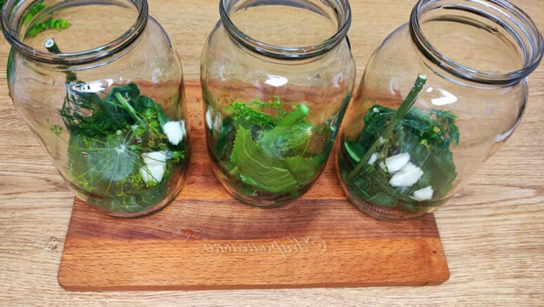 На дно стерилізованої банки укладаємо лист хрону, а також парасольку кропу за бажання можна додати лист вишні або смородини.