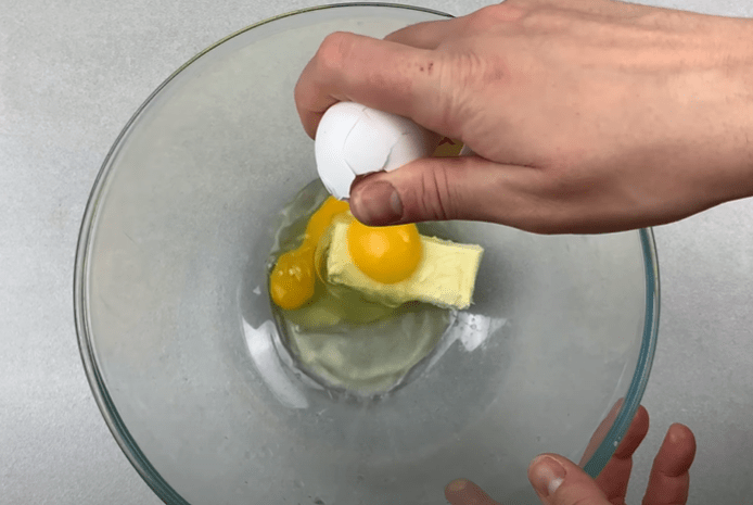У глибоку миску додаємо розтоплене, але не гаряче вершкове масло. Розбиваємо 3 курячі яйця.