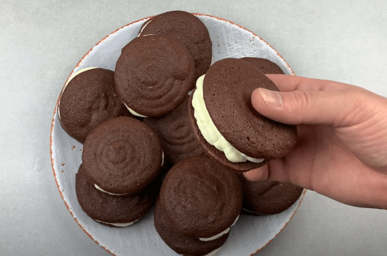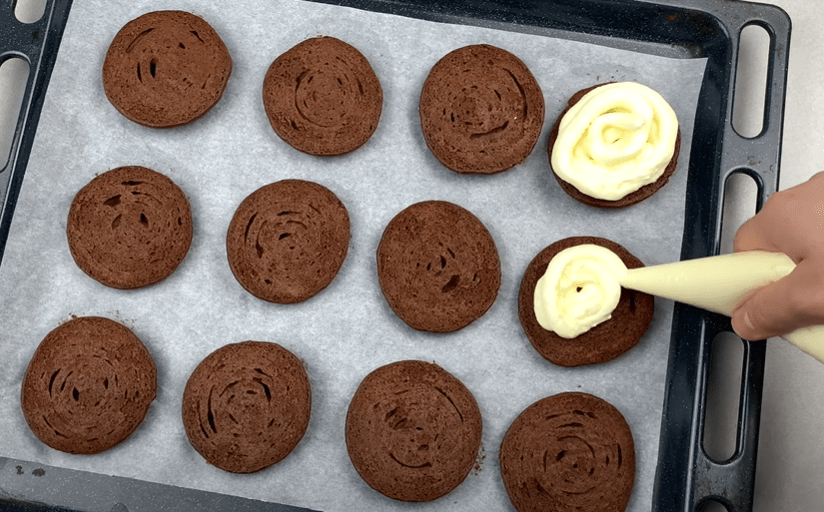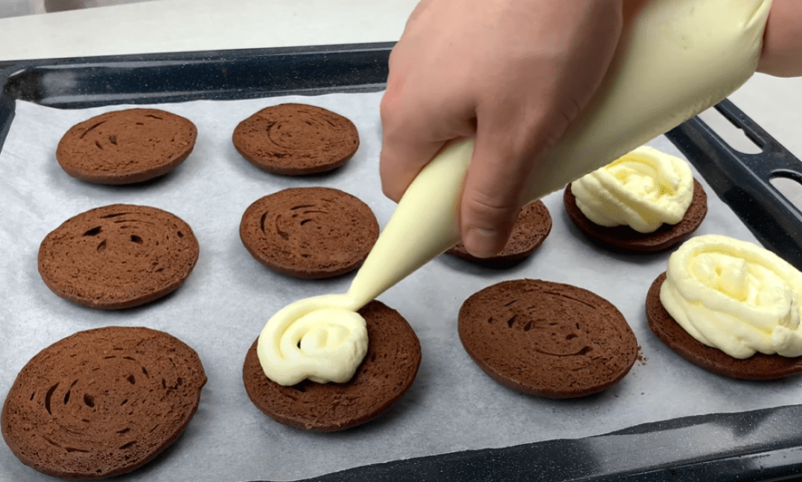 Перекладаємо крем в кондитерський мішок, переносимо його на печиво. Цієї кількості крему повинно вистачити на все печиво, тому не викладайте занадто багато крему.