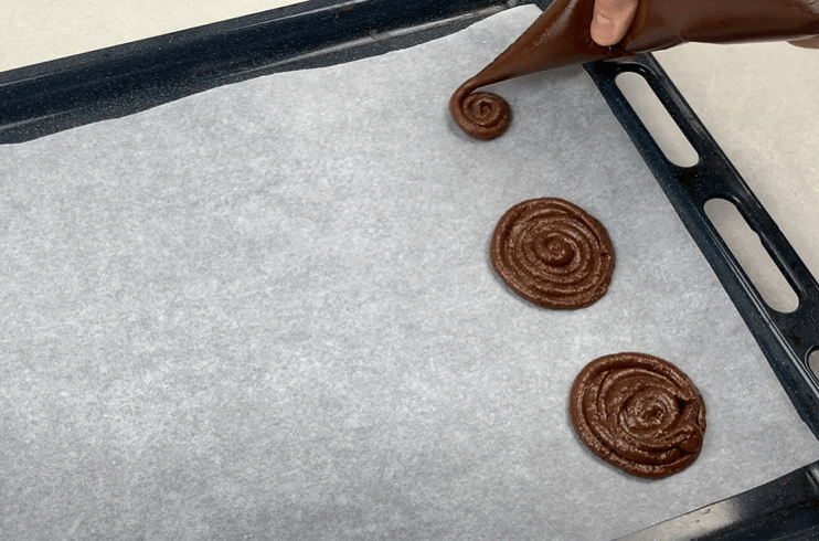 Перекладаємо тісто в кондитерський мішок. Застеляємо деко пергаментом. Відсаджуємо невеликі кружечки з тіста.
