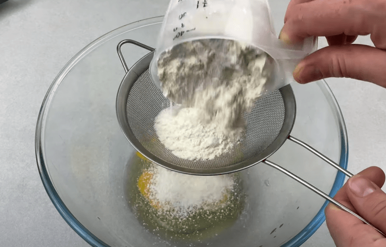 Додаємо пшеничне борошно, просіяне через сито і розпушувач.