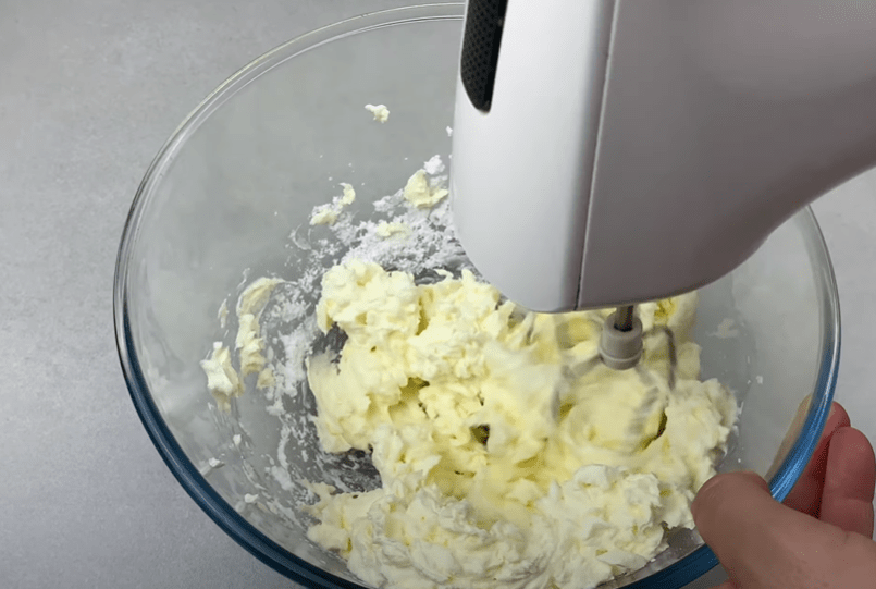 Для приготування крему в миску відправляємо м’яке вершкове масло, цукрову пудру і вершковий сир.