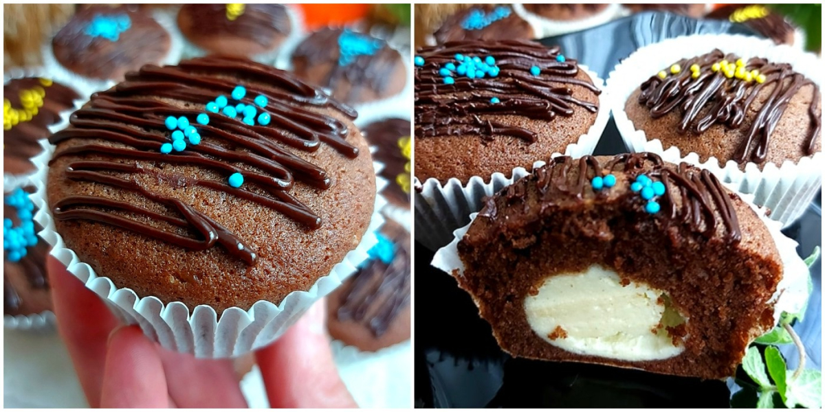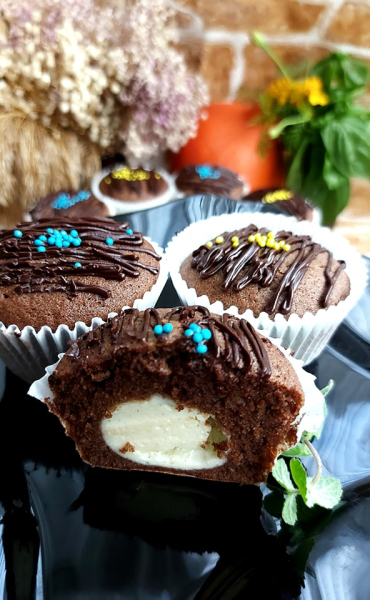 Шоколадне тісто викласти у формочку на 2/3, а тоді за допомогою кулінарного мішка ввести сирну масу у центр кекса. Випікати при 170 гр 20 хв.