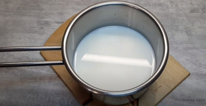 - В окремій ємності змішати молоко, цукор, какао. Поставити на вогонь і постійно помішуючи, довести до кипіння.