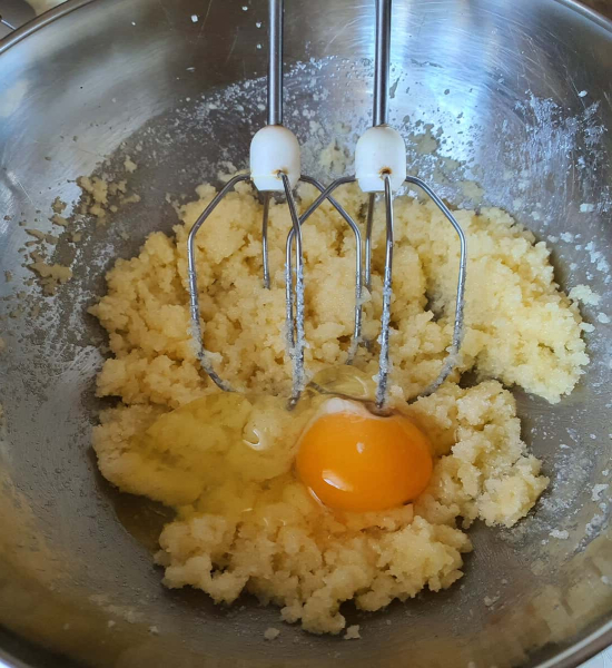 Продовжуючи збивати, додавати по одному яйцю.