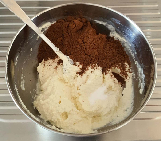 До манки зі сметаною додати соду і какао.
