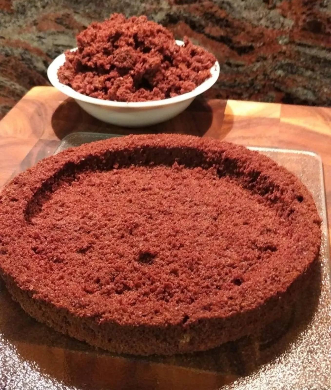 - З нижнього коржа виймаємо з центру м’якуш як на фото.