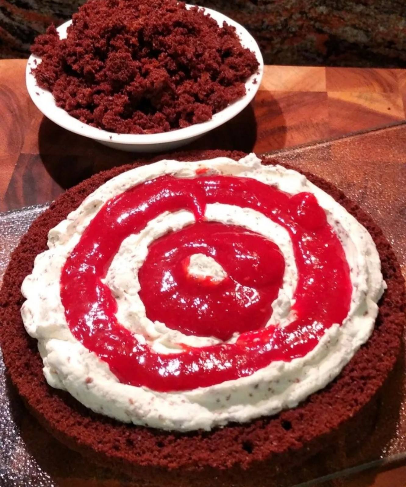 - Заповнюємо нижній корж кремом і фруктовою масою, утворюючи форму горбика.
