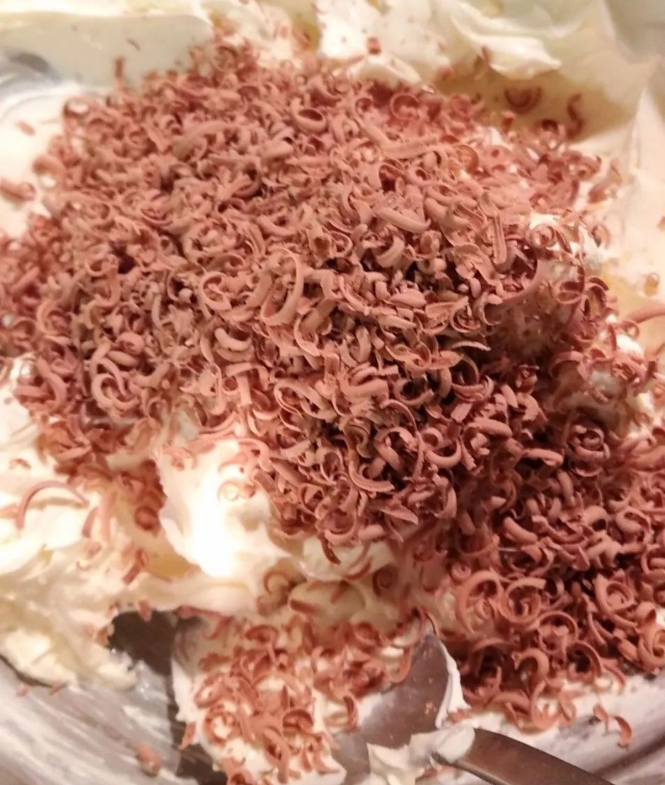 Всі інгредієнти / добре охолоджені /, крім шоколаду, збити до міцної консистенції. Змішати з тертим шоколадом.