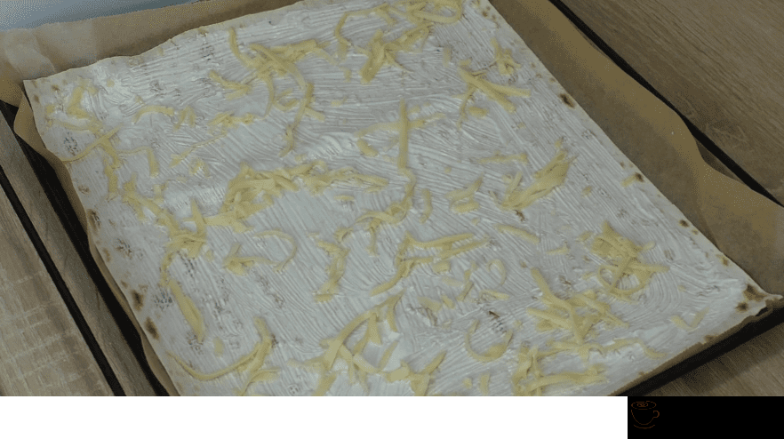Зверху кладемо другий лист лаваша, щільно притискаємо і повторюємо те саме. Змащуємо сметаною та посипаємо тертим сиром.