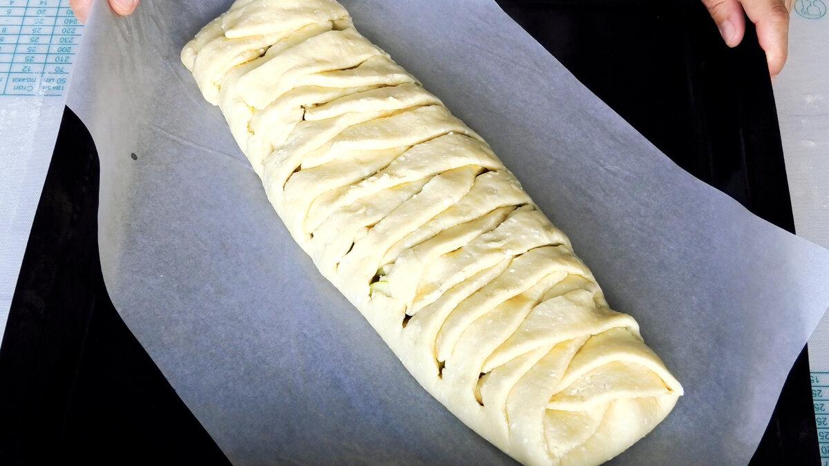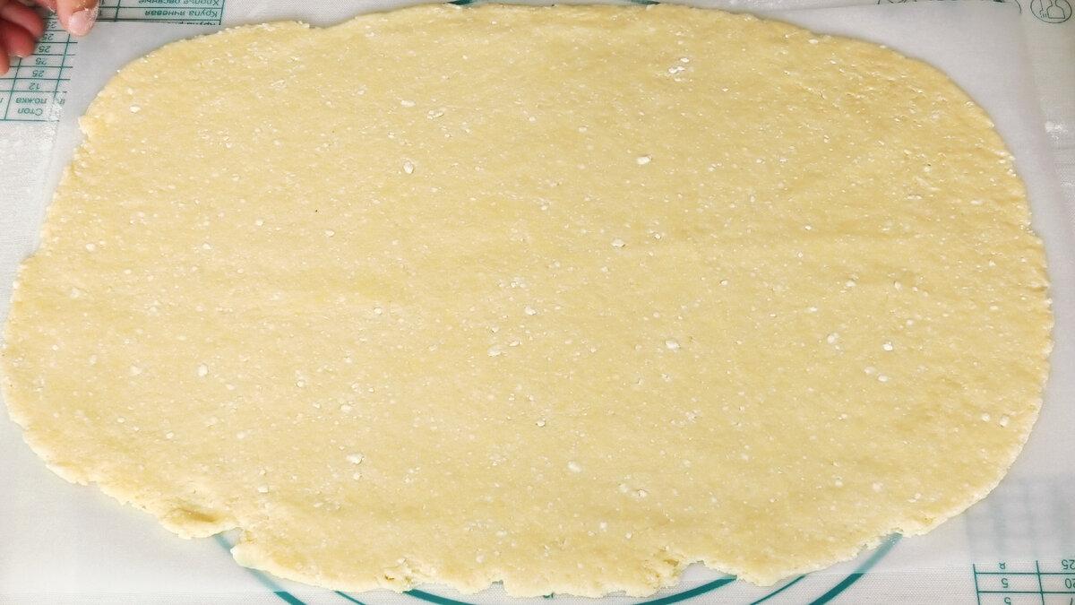 - Тісто розкачати в прямокутний пласт відразу на пергаменті.