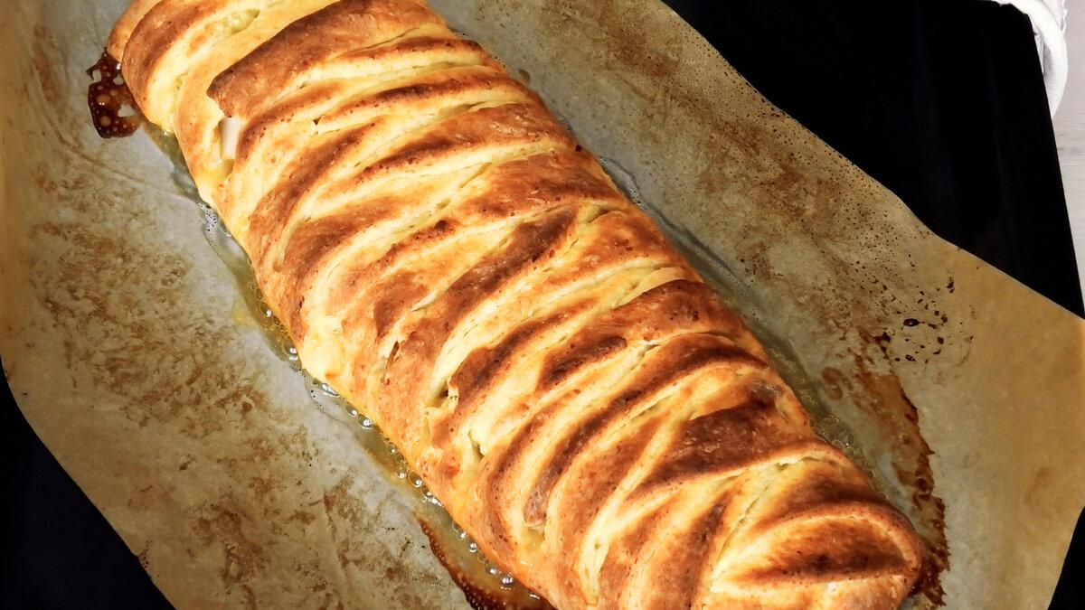 - Перенести плетінку на деко. Випікати сирну плетінку з грушами в розігрітій духовці при 180° С близько 25-30 хвилин.