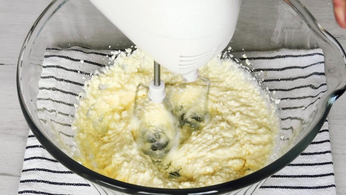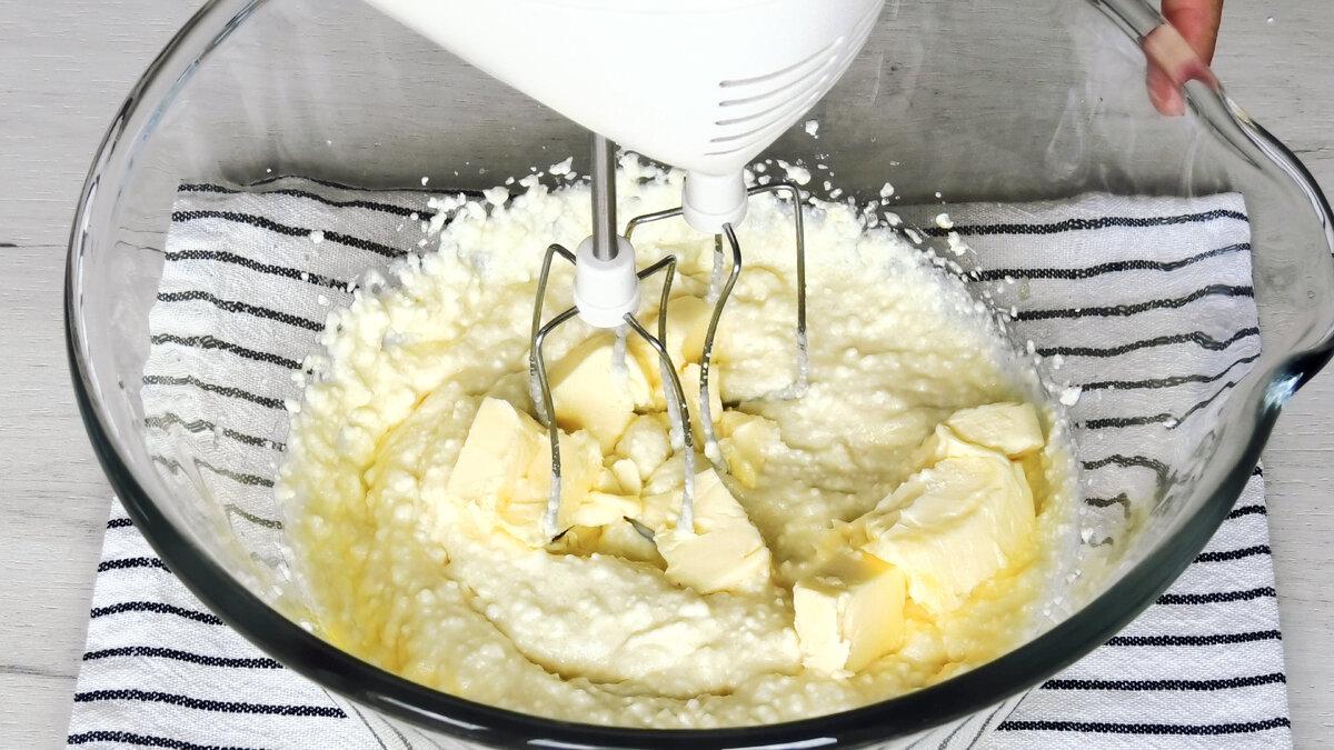 - Для тіста до сиру додати цукор, ванільний цукор, сіль і яйце. Все збити міксером.