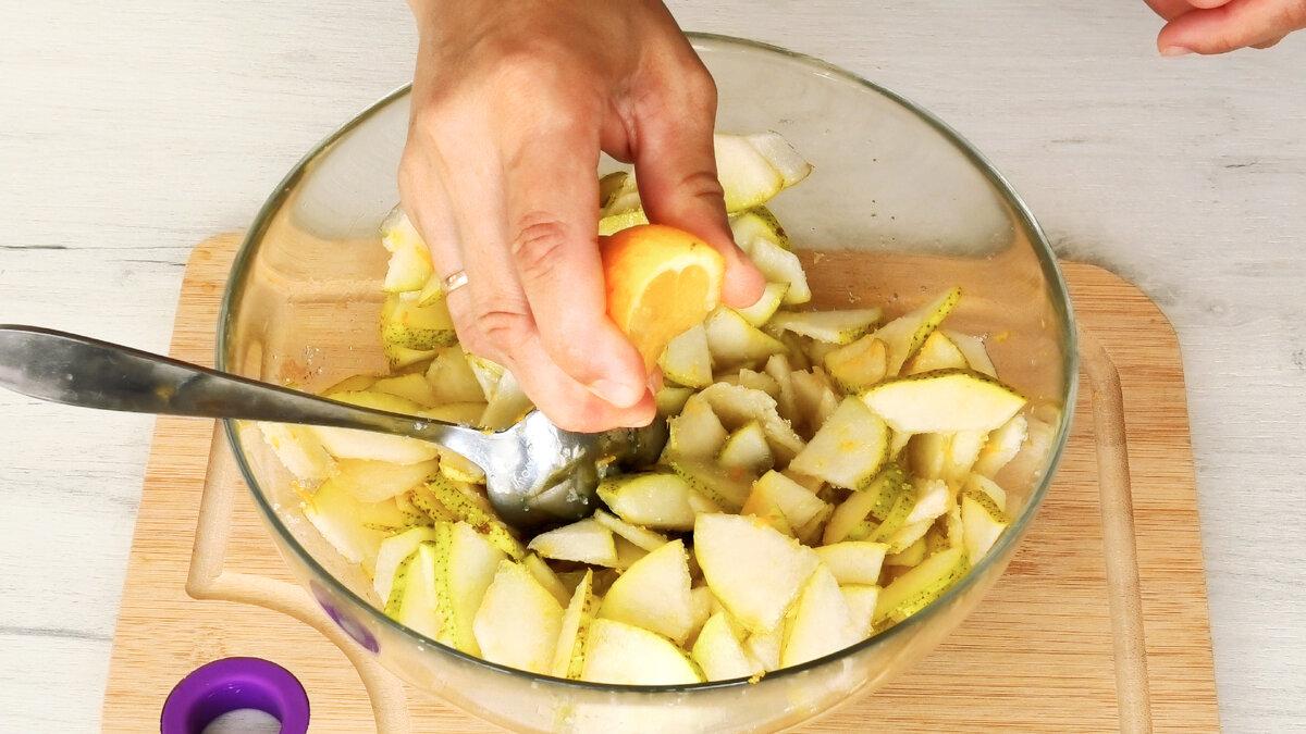 - Додати до них цукор, лимонну цедру і сік лимона. Цукор додавайте до смаку, тому що груші бувають різні і по солодкуватості і по соковитості.