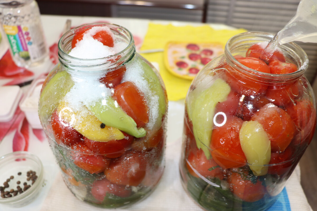 3. Після цього, воду з банок я зливаю в раковину. У банки з помідорами відправляю по три столові ложки цукру і по ст. ложці солі. Туди ж додаю перець запашний горошком. Вливаю оцет. Заливаю все знову крутим окропом. І закручую кришками.