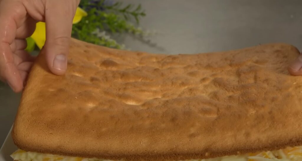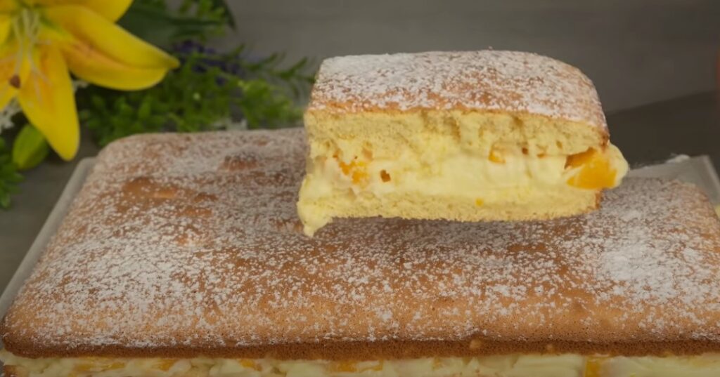 - Перекладаємо персики у вершкову масу, змішуємо. Приготовлений бісквіт розрізаємо горизонтально на два коржі. Вершки з’єднуємо зі згущеним молоком, просочуємо цією рідиною коржі.