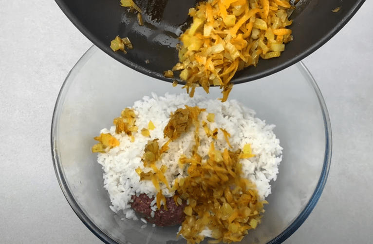 Відправляємо фарш в глибоку миску. Додаємо промитий рис і зажарку.