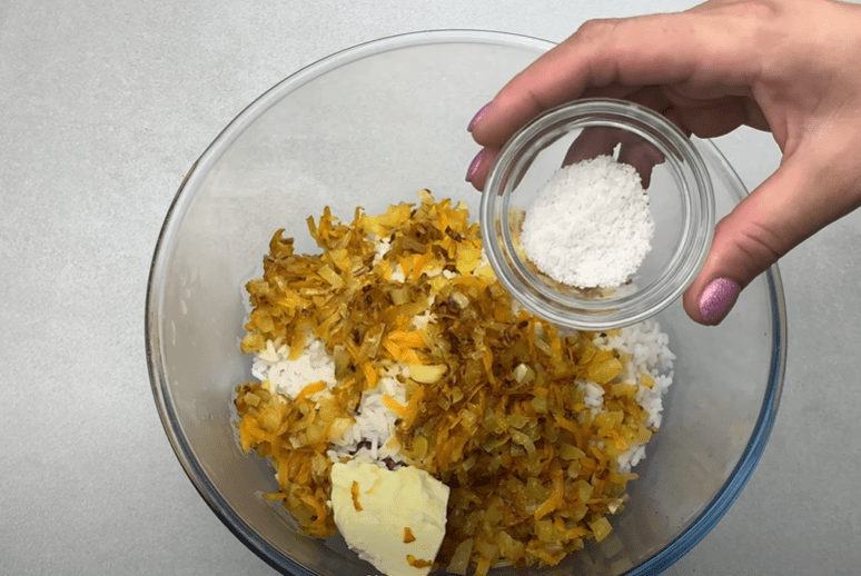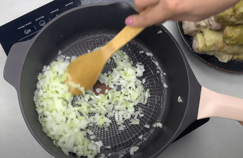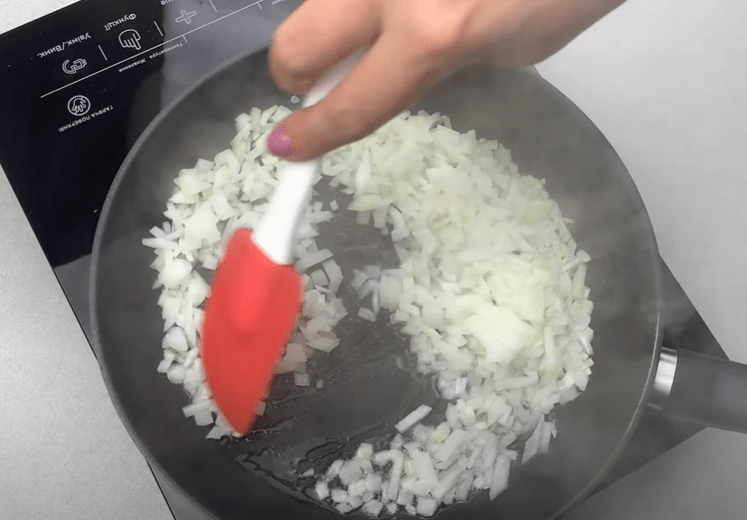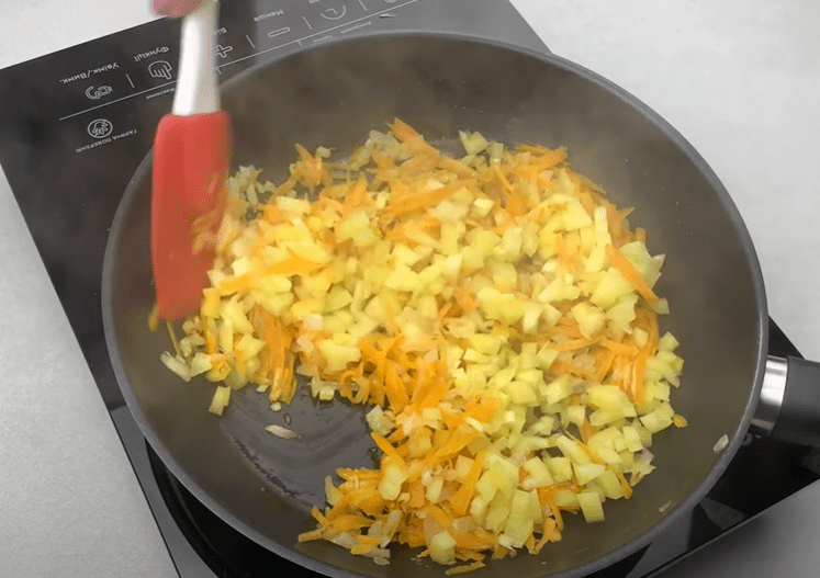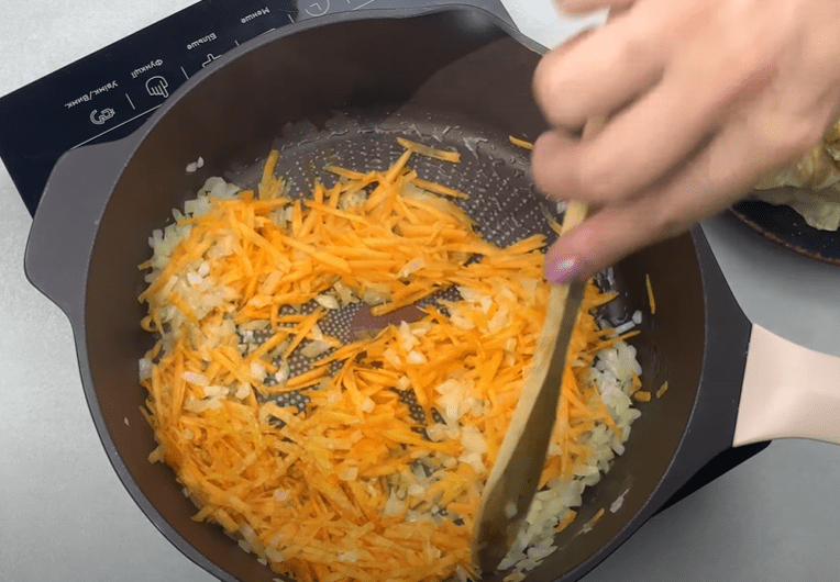 Ставимо сковороду на вогонь, додаємо дрібно нарізану цибулю. Обсмажуємо до золотистого кольору. Додаємо моркву, натерту на терці. Обсмажуємо кілька хвилин.