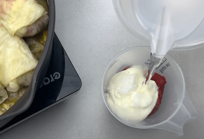У піалі змішуємо томатну пасту, сметану і сіль. Заливаємо водою.