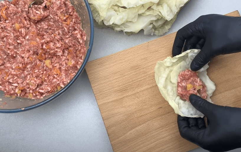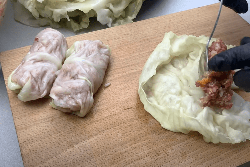 Ложкою накладаємо фарш в капустяні листи. Загортаємо голубці.