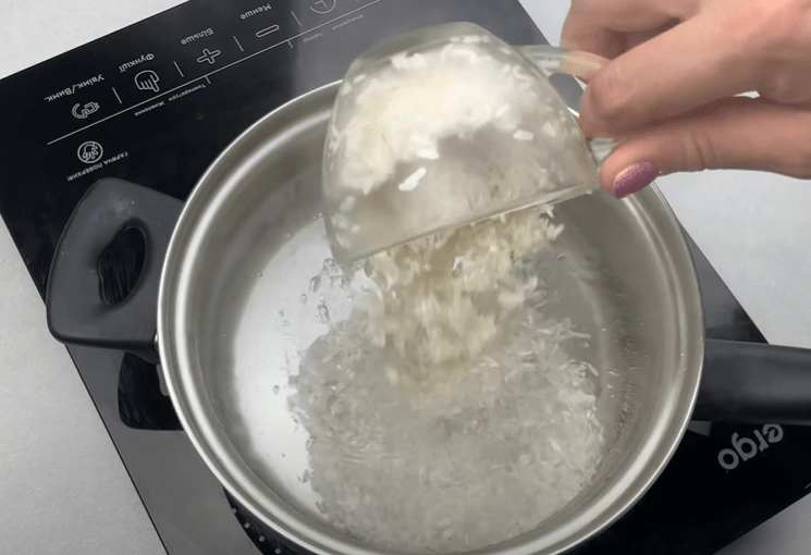 Ставимо на вогонь сотейник, наливаємо воду і додаємо рис. Перемішуємо і варимо до напівготовності. Промиваємо рис холодною водою.