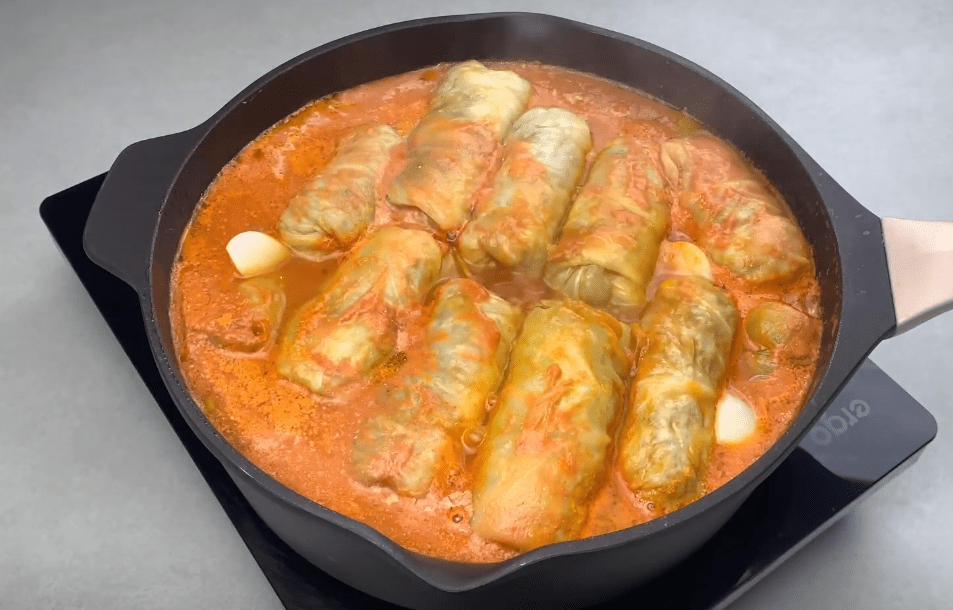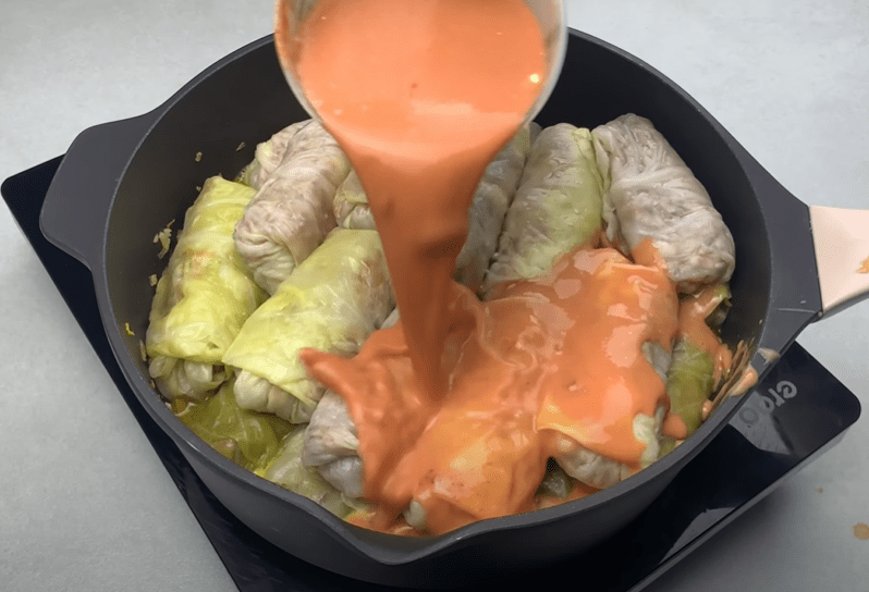 Заливаємо отриманою сумішшю голубці. Накриваємо кришкою і тушкуємо 30 хвилин.