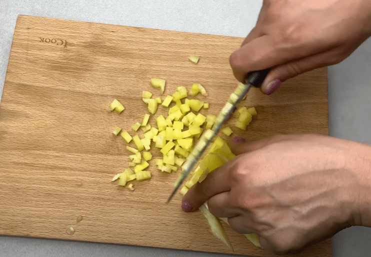 Болгарський перець нарізаємо на невеликі кубики, відправляємо в сковороду. Перемішуємо, обсмажуємо 2 хвилини і прибираємо з вогню.