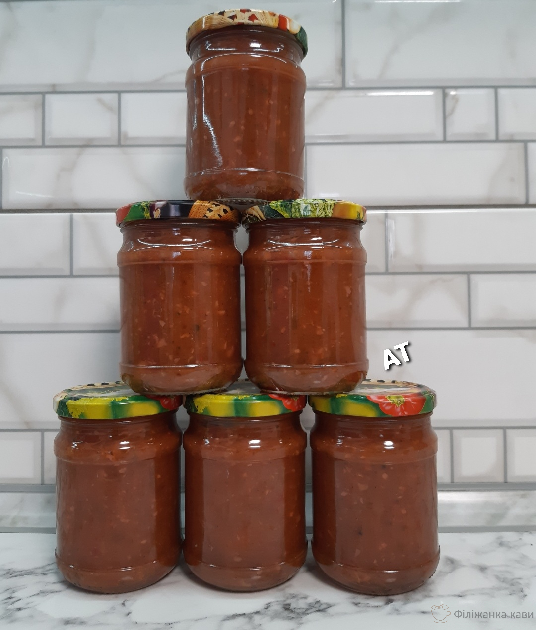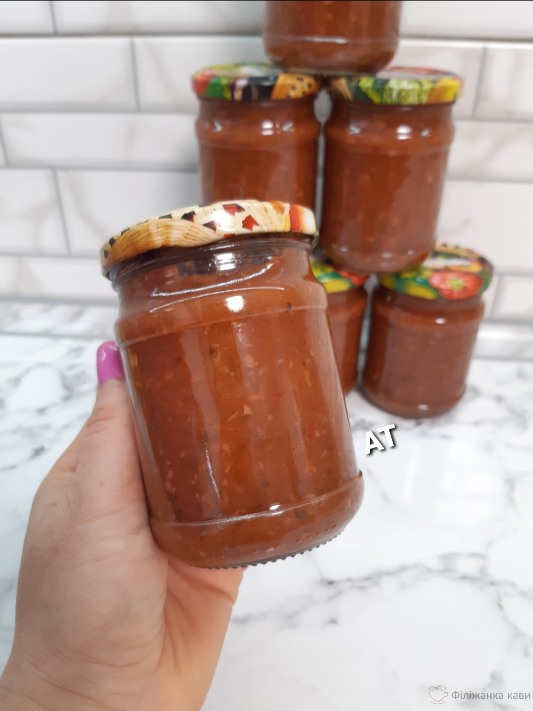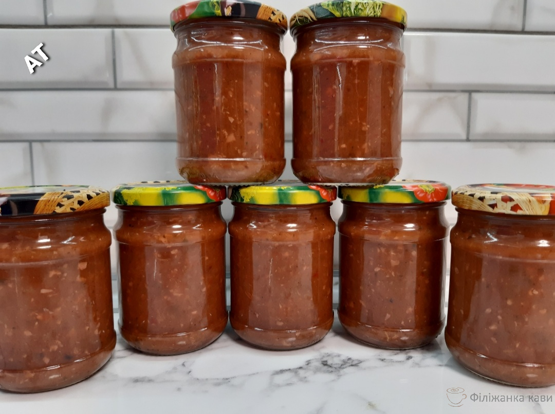 - Готовий соус розливаємо у стерильні банки і щільно закручуємо кришками.