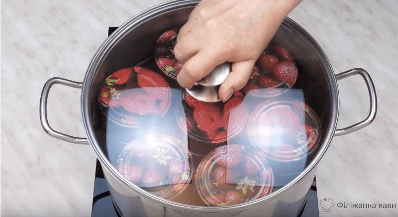 Дно каструлі закриваємо решіткою або застеляємо тканиною, щоб банки не торкались дна. Виставляємо банки з полуницею в каструлю, в яку потім заливаємо теплу воду. Вода повинна на 2-3 см не доходити до шийки, щоб під час кипіння вона не залилася в банку.
