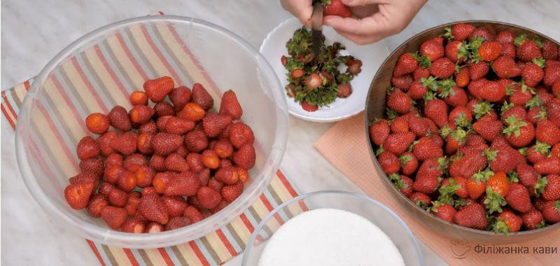 Спочатку добре миємо й просушуємо ягоду, тільки після цього видаляємо плодоніжки. Якщо прибрати їх раніше, полуниця може пом’ятися, так як плодоніжки вбирають вологу, а значить, запобігають розкисанню ягоди.