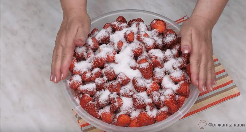 Будемо складати полуницю шарами і пересипати цукром зі співвідношення: на 1 кг ягоди – 250-300 г цукру. Так викладаємо всю полуницю і залишаємо її віддавати сік на 8-12 годин, а краще на всю ніч.