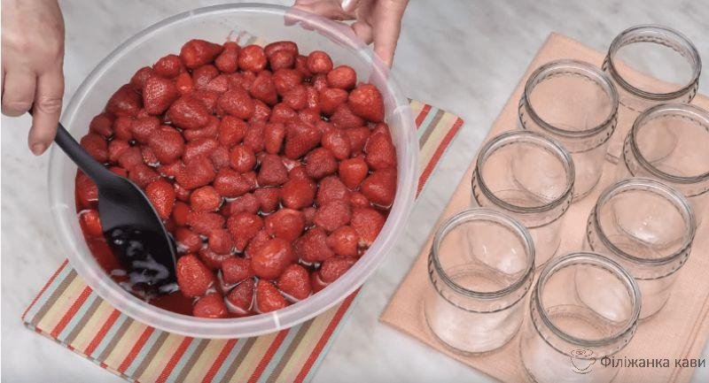 Після ночі полуниця дуже добре віддала сік. Тепер розкладаємо її в підготовлені баночки приблизно по плечики. Спочатку розкладаємо ягоду без соку, так як на дні швидше за все залишився цукор.
