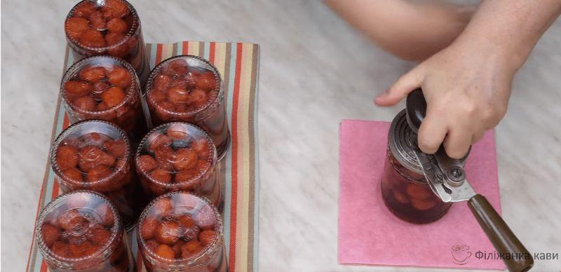 По закінченні цього часу виймаємо банки з каструлі, закатуємо, перевертаємо догори дном і залишаємо до повного охолодження без додаткового укутування.