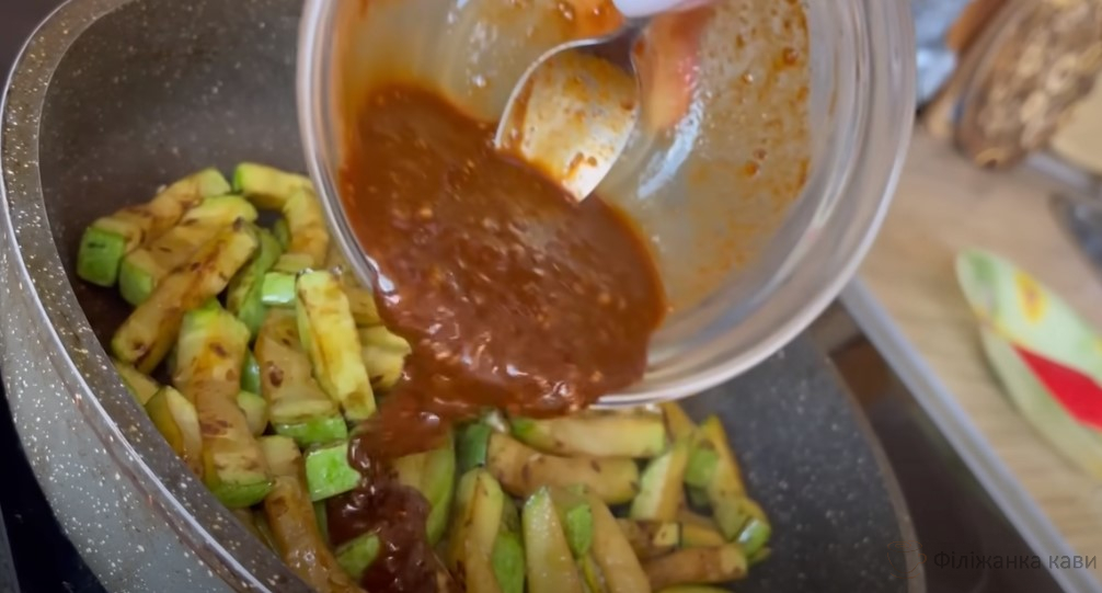 Викладаємо всі кабачки в сковороду та заливаємо соус, перемішуємо та тушимо близько 1 хвилини.