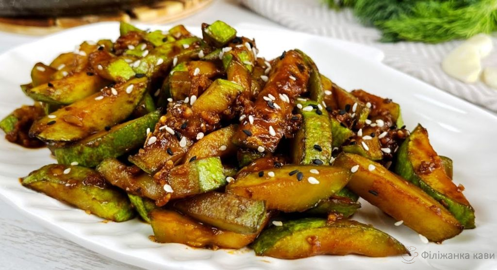 Посипаємо за бажанням кунжутом або рубаним кропом. Таку страву відмінно доповнює молода відварена або запечена в духовці картопля, курячі крильця, відбивні або свинячі реберця в медовому соусі. Коли закуска постоїть у холодильнику ніч, вона стає ще смачнішою та насиченішою за ароматом.