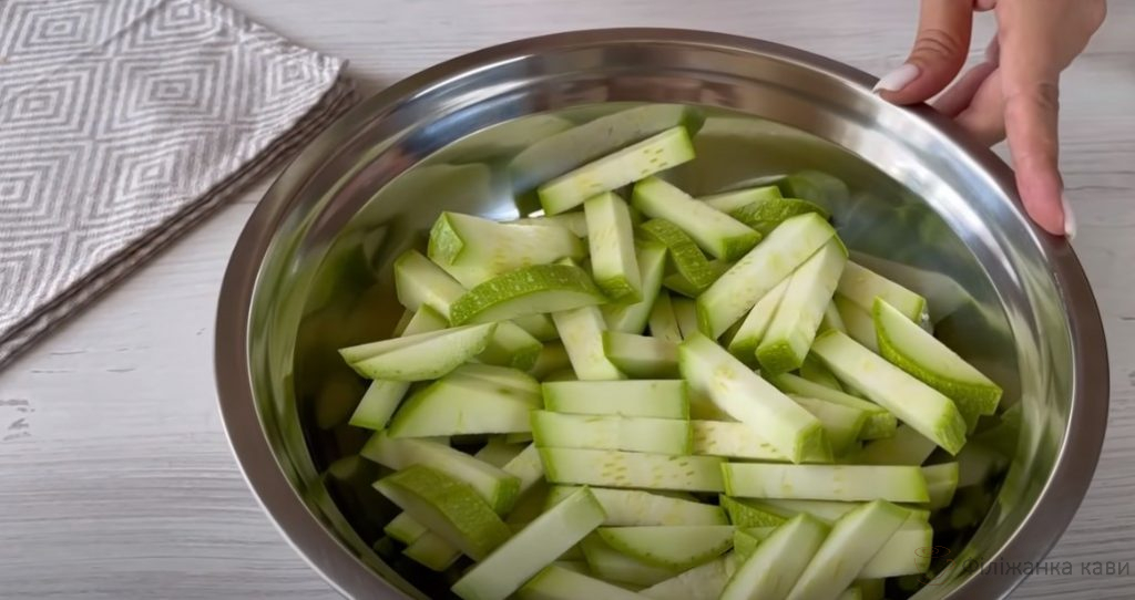 Кабачки ріжемо брусочками, поливаємо олією і перемішуємо. Це допоможе використовувати менше олії для обсмажування.