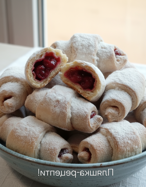 Берете цукрову пудру і обмакуєте кожен рогалик щедро в пудрі..Краще трохи охолонувші, не зовсім гарячі. Так краще прилипає пудра.