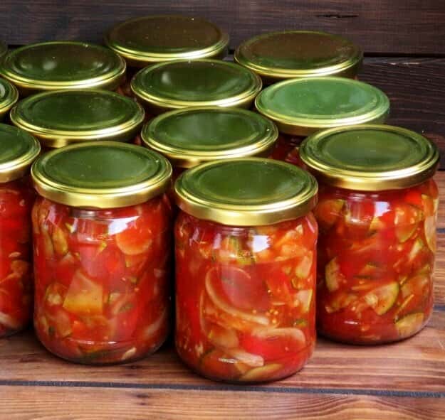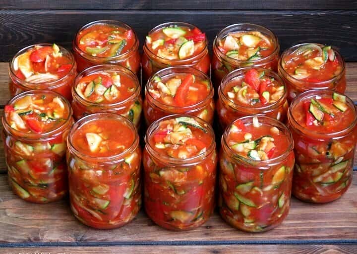 4 ) Викласти овочеву нарізку в банки, залити соусом так, щоб покрив. При цьому соусу не повинно бути багато: це салат із заправкою, а не томатний суп з кабачками: )