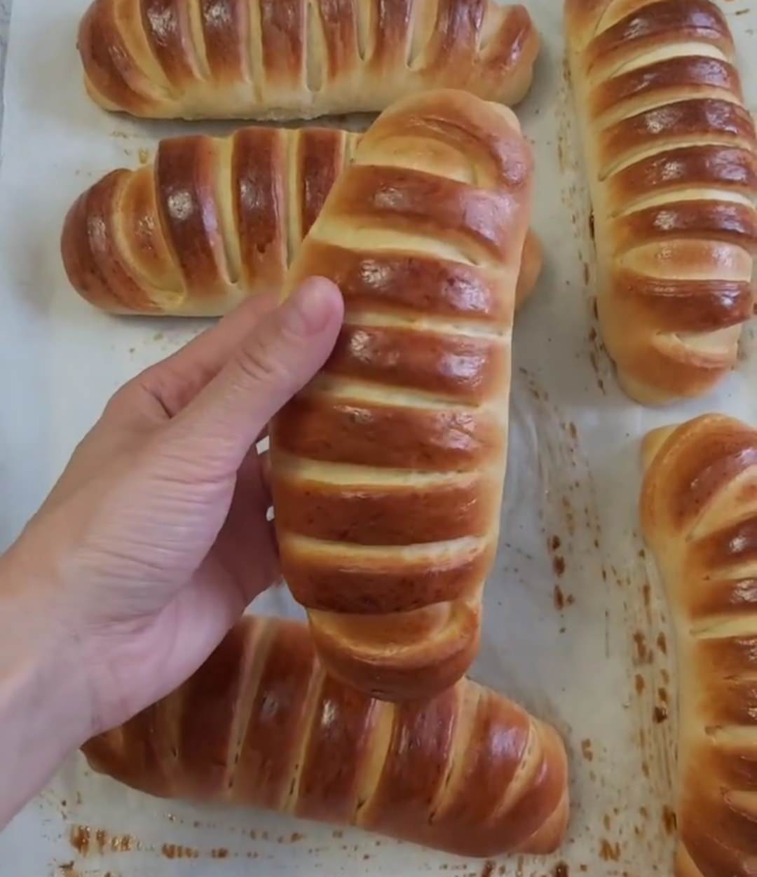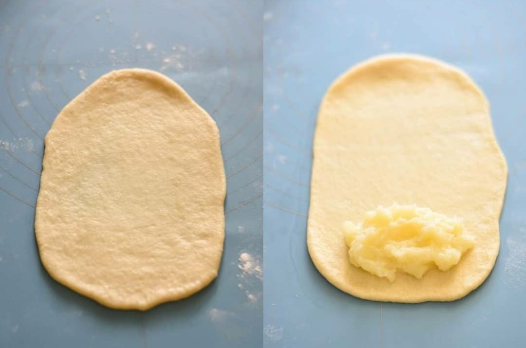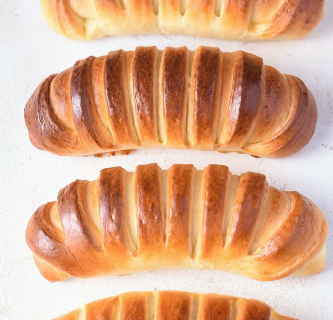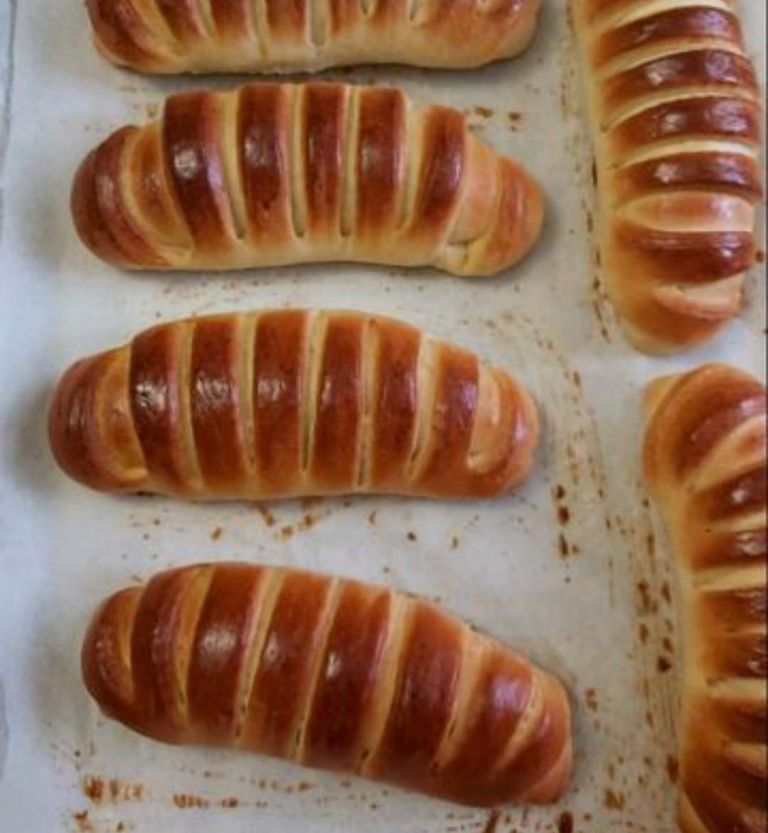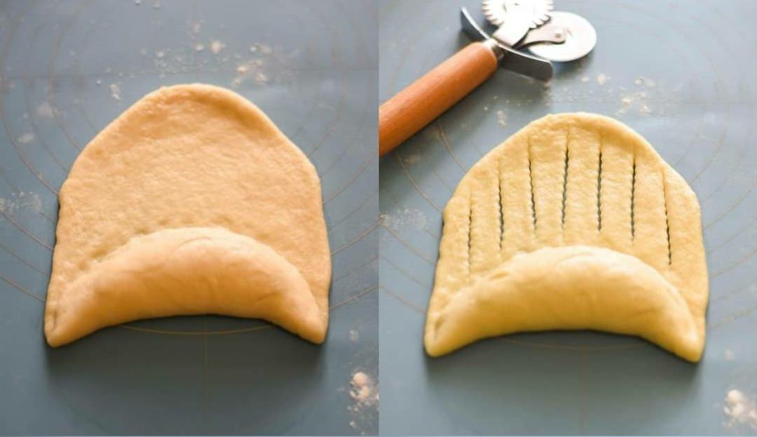 - Кульки розкачати в овал, викласти крем , край з кремом загорнути і добре закріпити, решту тіста розділити роликом на смужки не до кінця, катати булочку.