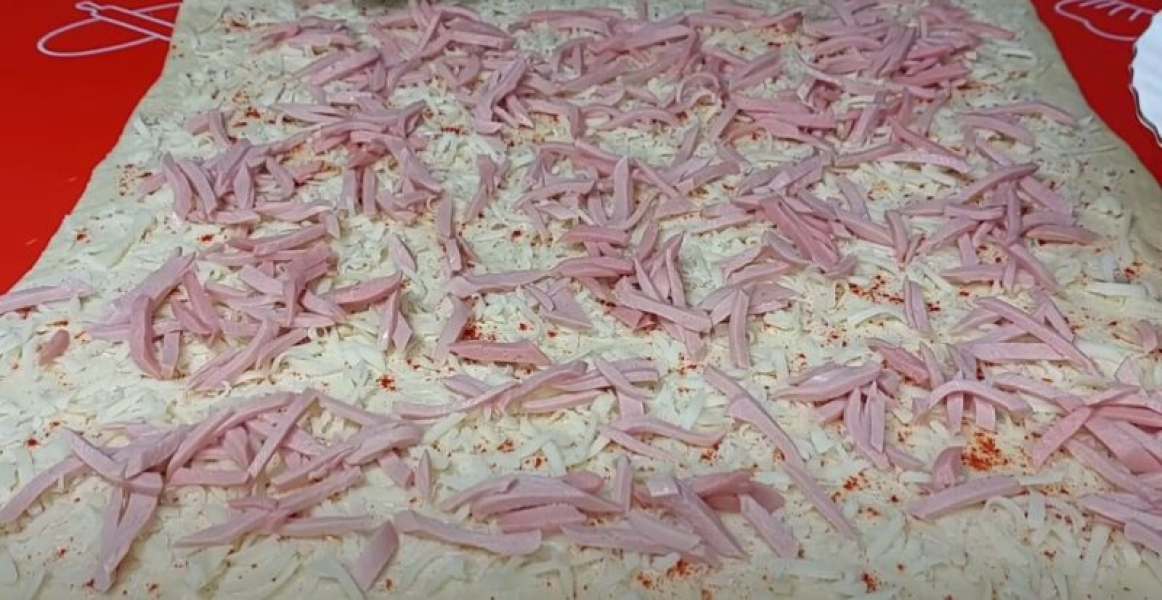 Подрібнюємо на середніх зубцях терки сир, нарізаємо ковбасу на невеликі брусочки. Посипаємо пласт тіста паприкою, рівномірно розділимо поверхнею сирну стружку і ковбасу.