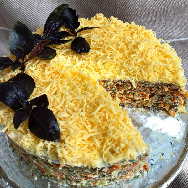 Кожен корж змастити майонезно-сметанним соусом (~ 1,5 ст. л), зверху розкласти морквяно-цибулеву засмажку (~2 ст. л.)