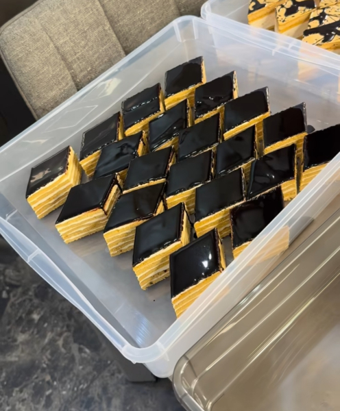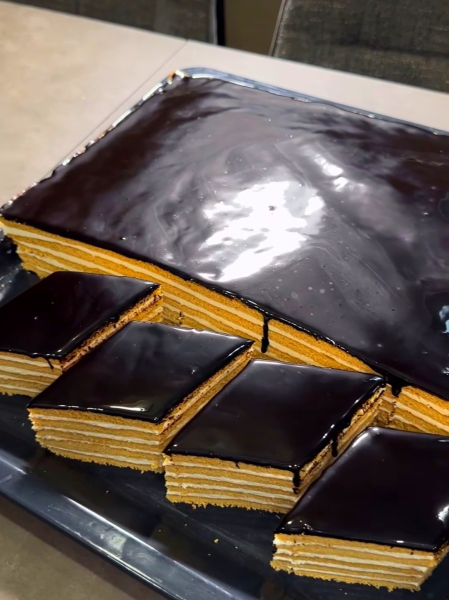 🔜Збираємо коржі, змащуючи кожен шар кремом. Верхіку залишаємо для глазурі.