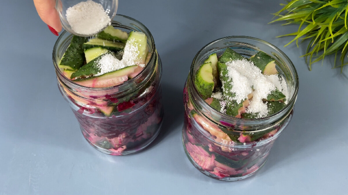3. Наповнюємо банки підготовленими огірочками до половини банки, потім додаємо буряк натерту на великій терці і зверху знову огірочки до самого верху банки.