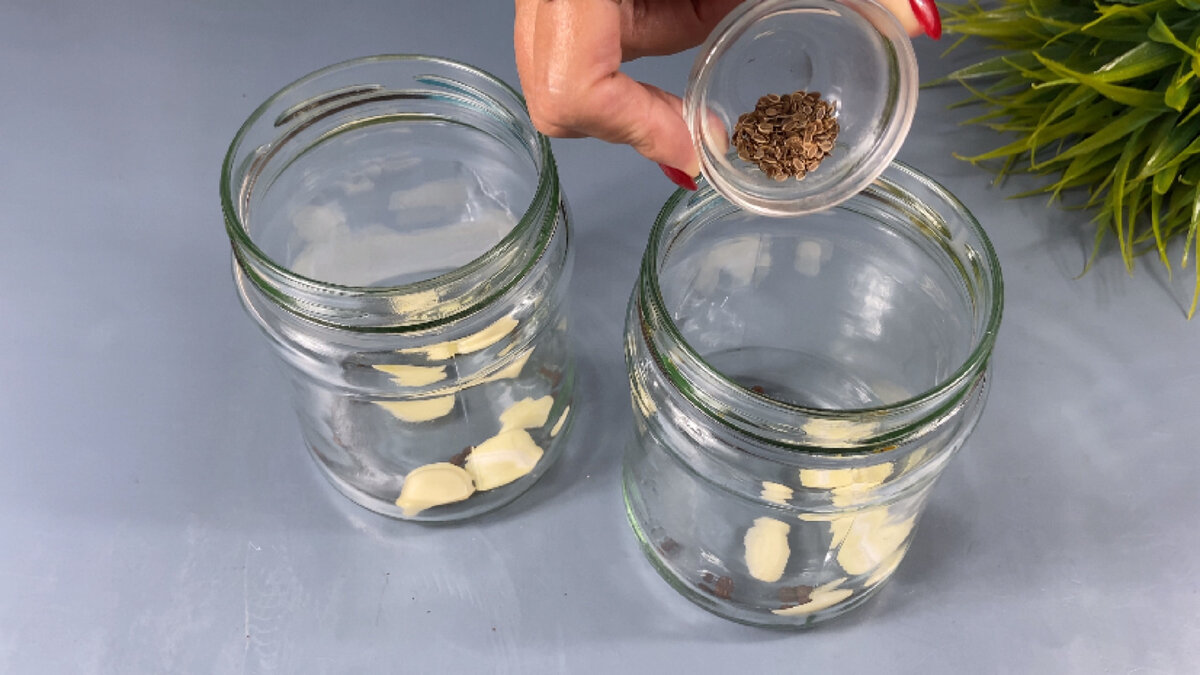2. Дві банки, об’ємом 1 літр кожна, добре миємо і на дно кожної кладемо часник нарізаний пластинами, перець горошком і насіння сушеного кропу.
